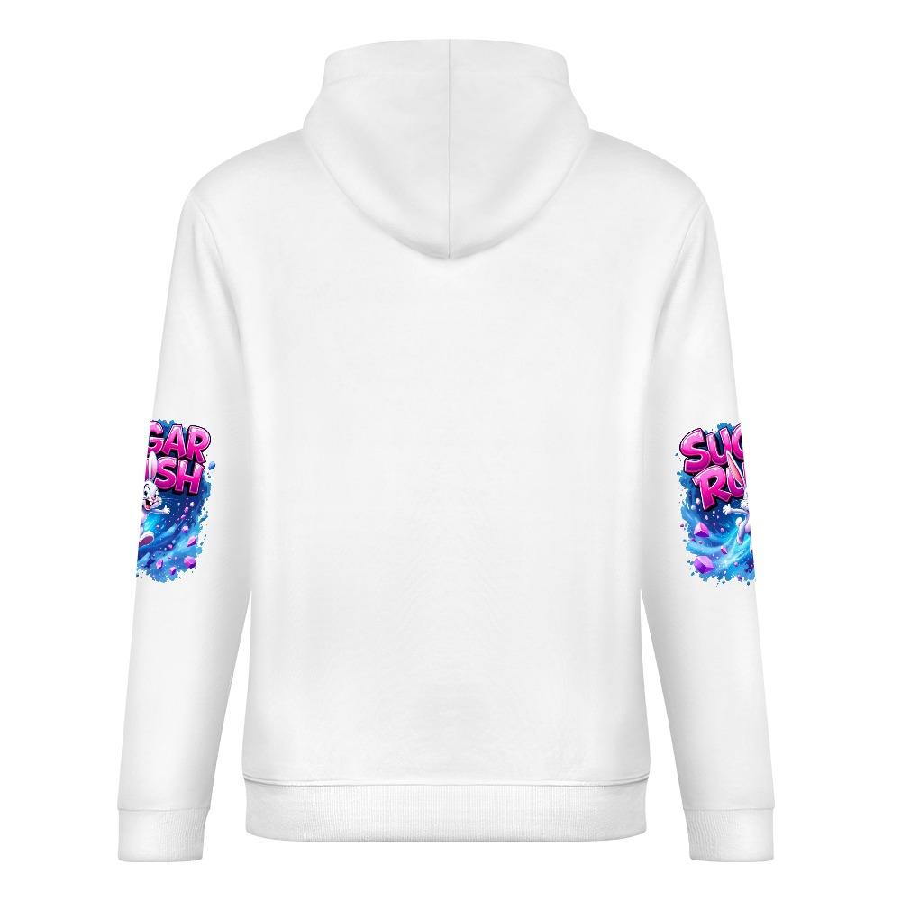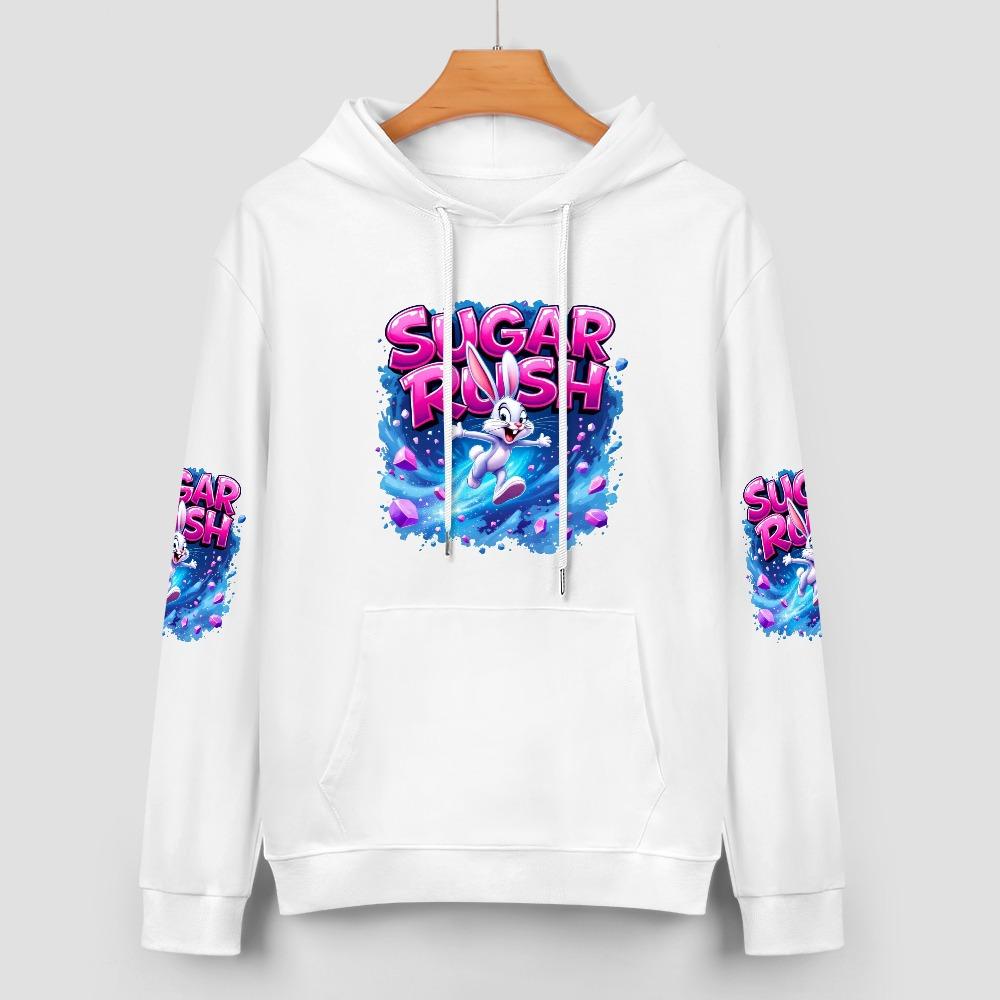 The Sugar Rush Hoodie is pure energy in hoodie form. With a wide-eyed cartoon bunny bursting through neon blue splash waves under bold pink SUGAR RUSH lettering, this pullover hits like your first soda at midnight. Sleeve prints bring the fun full-circle, giving you all-over energy, color, and bounce. Whether you’re on the move, on the edge, or just feeling chaotic cute, this hoodie was made to pop.【 Material description 】