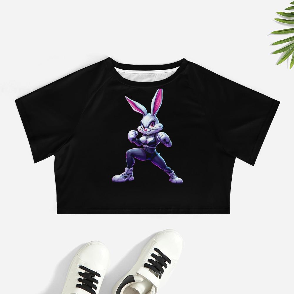 The Fight Bunny Crop Top brings knockout energy with a side of sass. Featuring a fierce cartoon bunny in full kickboxing stance, this design blends athletic power with flirty attitude. Bold shading, killer curves, and those signature pink ears make this bunny the baddest on the block. Cute? Sure. But she bites.