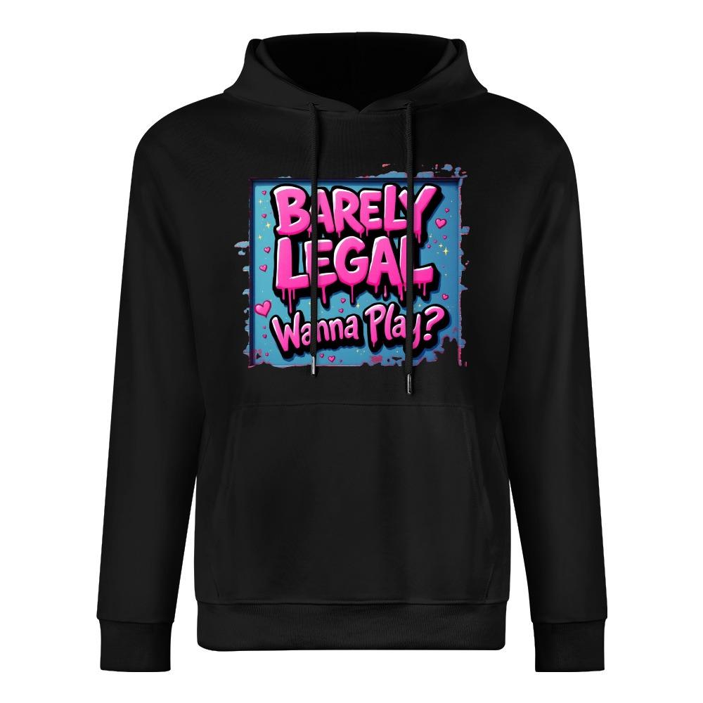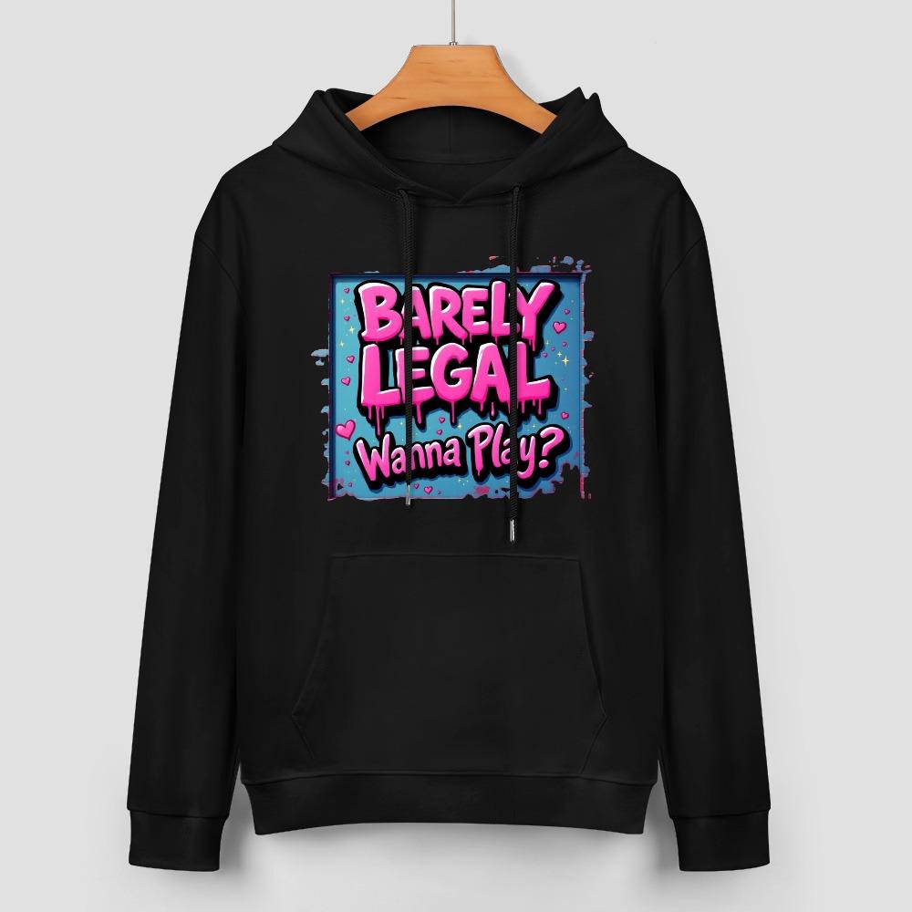 Barely Legal – Wanna Play? Hoodie – Bold Black Hoodie with Flirty Neon Text