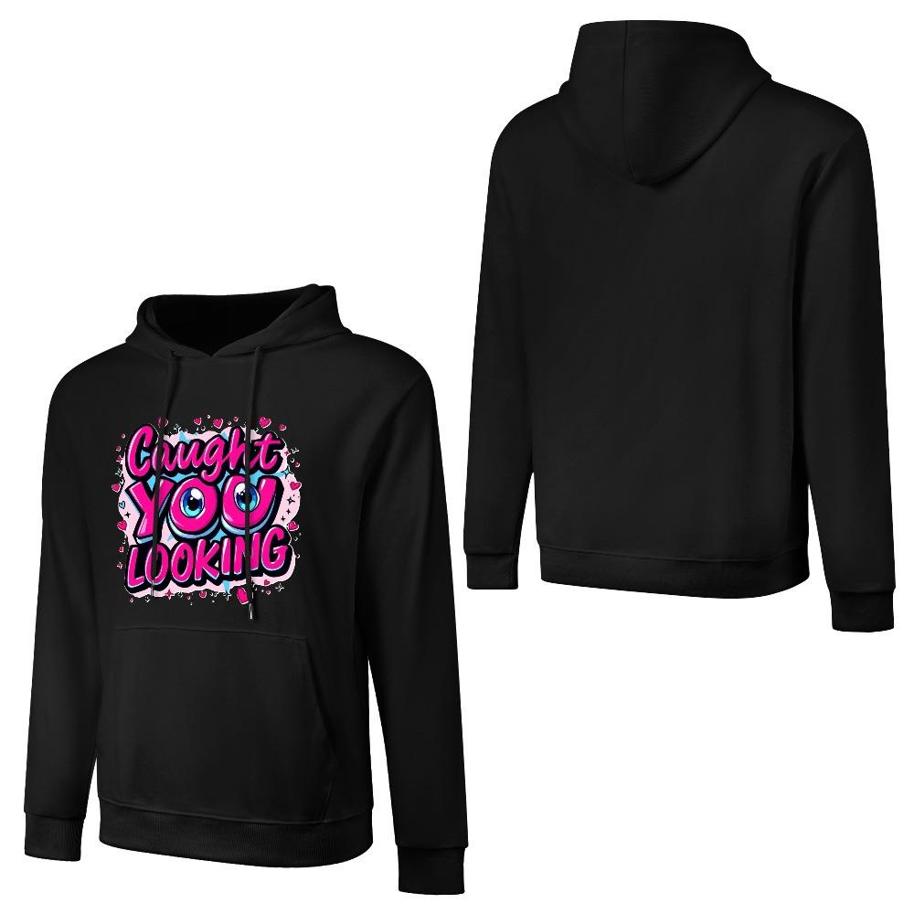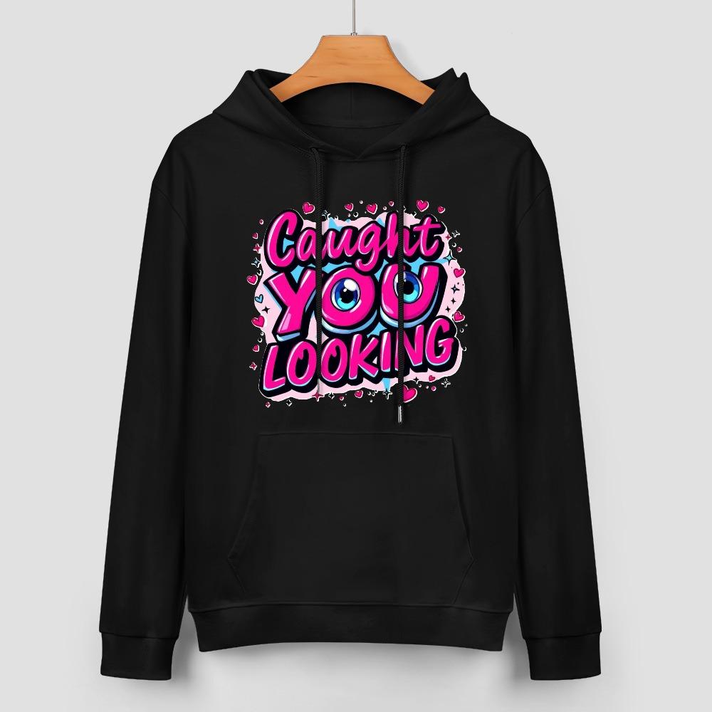 The Caught You Looking Hoodie is all sass and no apologies. Featuring bold pink and blue bubble text and cartoon eyes front and center, this black hoodie is made to grab attention — and call it out. Whether you’re teasing your crush or making strangers blush, this one says exactly what they’re thinking.【 Material description 】