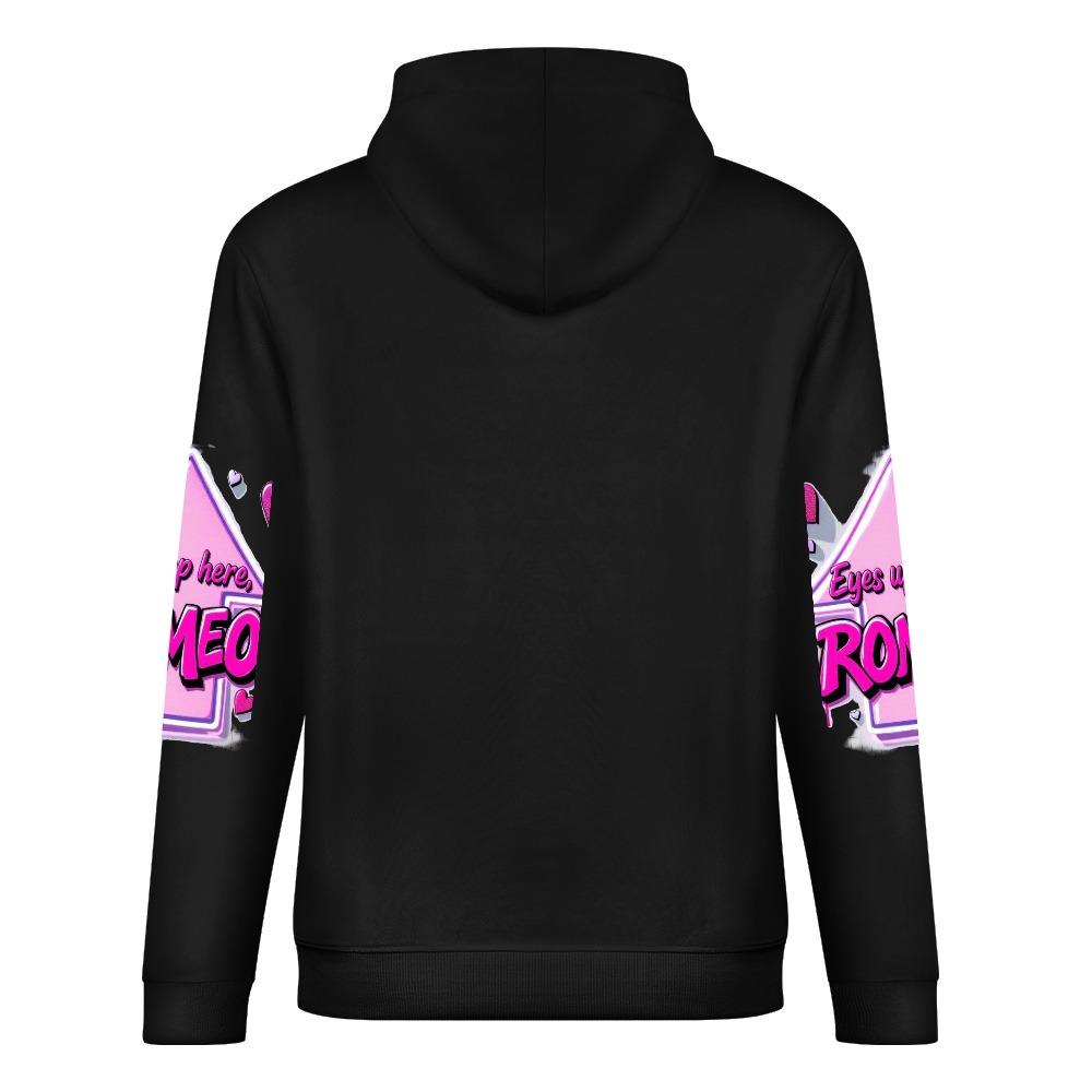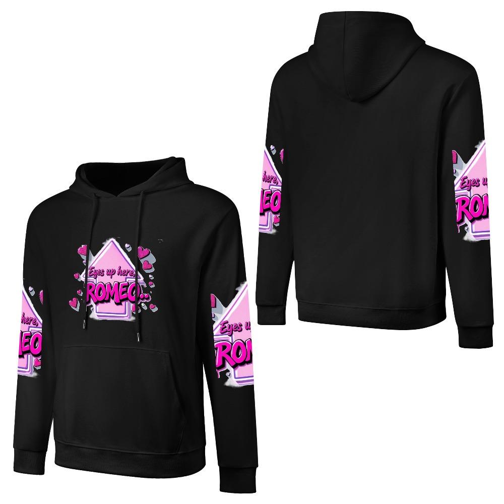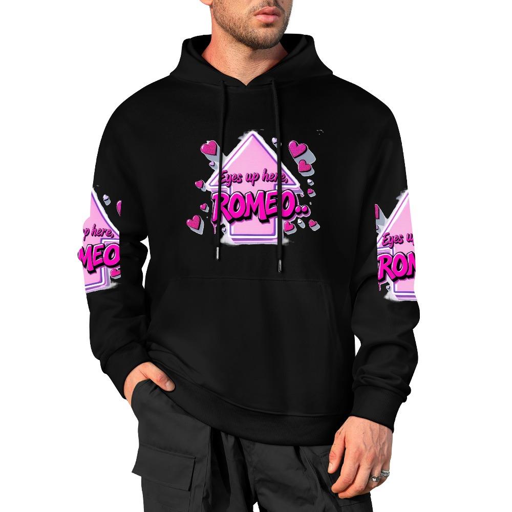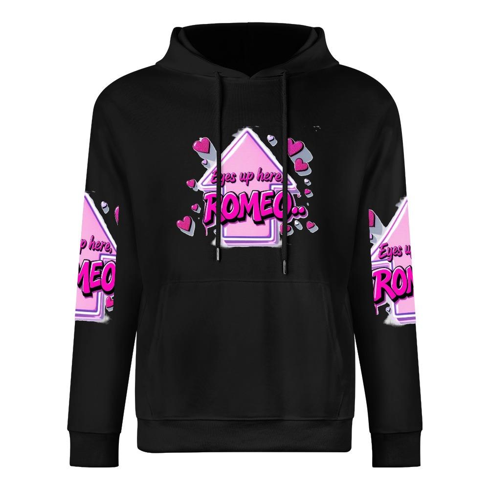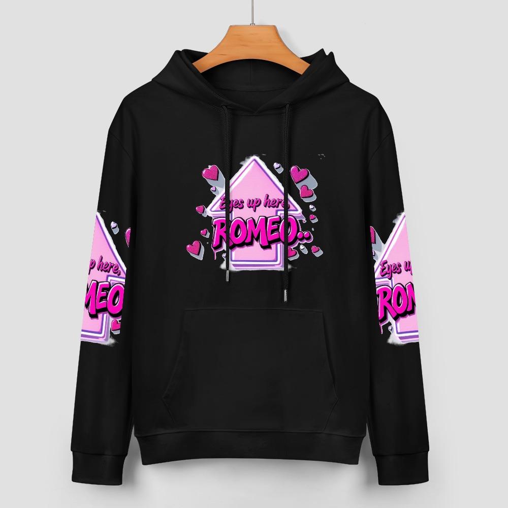 The Eyes Up Here, Romeo Hoodie is sass in streetwear form. With a big pastel arrow pointing up and the bold message “Eyes Up Here, Romeo” in hot pink letters, this black hoodie lets them know exactly where to look — and who’s in charge. Matching sleeve prints seal the deal with playful confidence and flirty flair.【 Material description 】