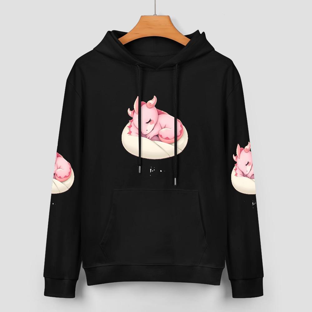 The Nap Time Dragon Hoodie wraps you in pure sleepy magic. Featuring an adorable pink dragon curled up on a pillow across the chest and printed again on each sleeve, this black hoodie brings gentle fantasy vibes and dreamy comfort. Perfect for chill days, cozy nights, and soft hearts who need a break from the noise.【 Material description 】