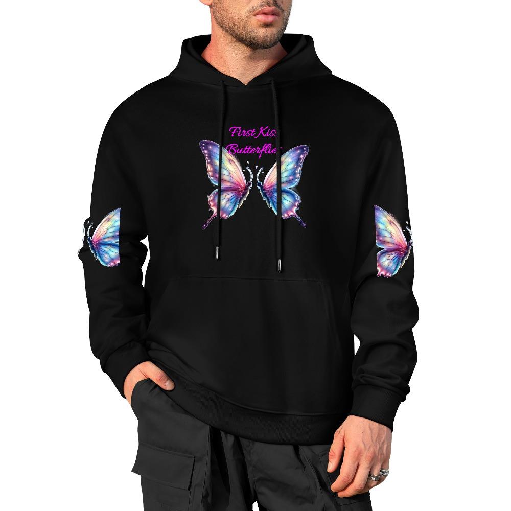 The First Kiss Butterflies Hoodie brings sweet energy and dreamy vibes to every step. Featuring a soft pastel butterfly graphic on the back with “First Kiss Butterflies” in glowing pink text, and matching wing prints down both sleeves, this black hoodie feels like falling in love for the first time. It’s perfect for hopeless romantics, butterfly collectors, and anyone who still believes in magic.【 Material description 】