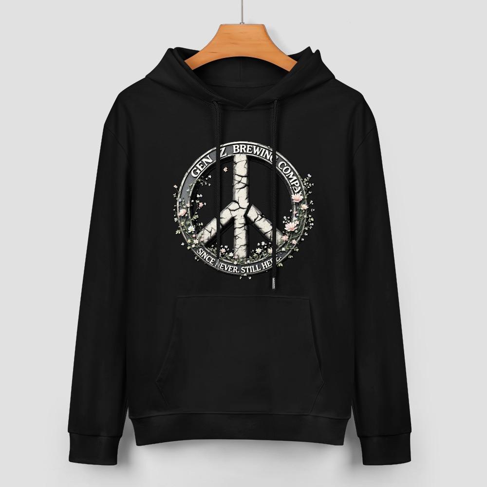 Gen Z Brewing Peace Hoodie – Black Hoodie with Floral Peace Sign and “Since You’re Still Here” Slogan