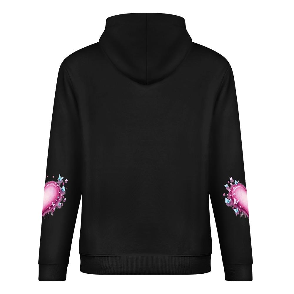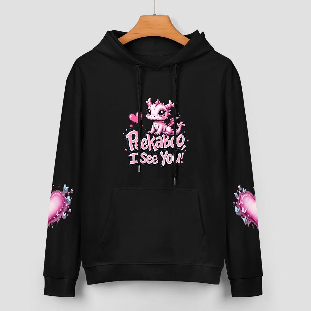 Peekaboo I See You Hoodie – Black Hoodie with Cute Pink Dragon and Heart Sleeve Graphics