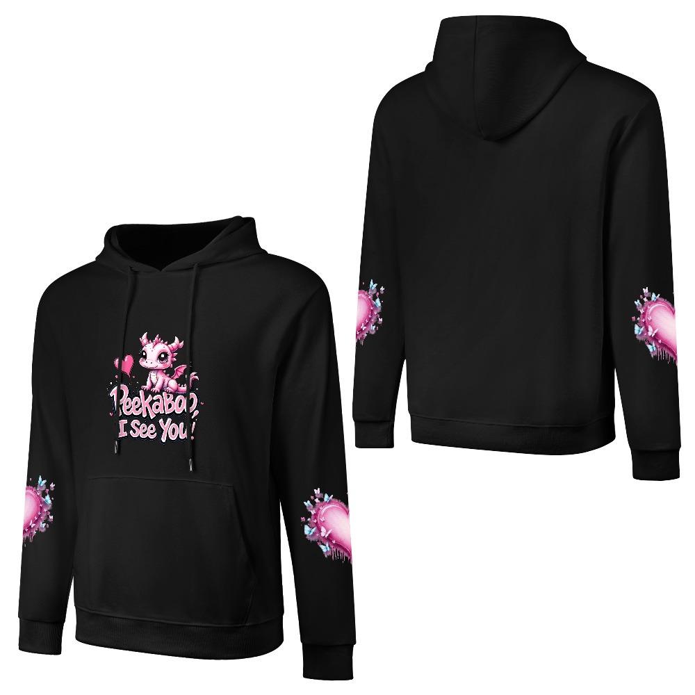 The Peekaboo I See You Hoodie is a playful burst of pastel magic and flirty fun. Featuring an adorable wide-eyed pink dragon peeking out with the cheeky phrase “Peekaboo, I See You!”, this black hoodie adds charm to every cozy moment. Detailed pink heart graphics on each sleeve complete the look with a dash of cuteness and confidence. Whether you’re feeling bold or bashful, this hoodie’s got your back — and your vibe.【 Material description 】