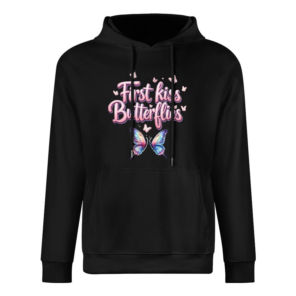 The First Kiss Butterflies Hoodie captures that sweet, fluttery feeling of a heart skipping a beat. With dreamy pink lettering surrounded by tiny hearts and a radiant pair of pastel butterfly wings, this black hoodie is perfect for soft girls, romantics, and anyone chasing that spark. Cozy, cute, and full of first-crush energy, it’s the perfect piece for journaling, daydreaming, or walking through your own coming-of-age moment.【 Material description 】