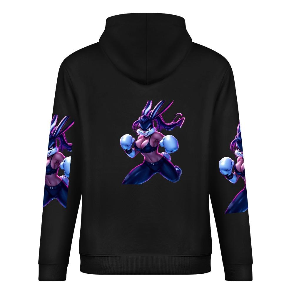 The Pink Boxer Bunny Hoodie delivers knockout style with a flirty edge. Featuring a fierce, muscle-toned bunny babe in vivid purple and pink tones, this black hoodie turns heads and sparks conversation. From her confident stance to the graffiti glow that surrounds her, this design was made to stand out. Perfect for those who fight hard, flirt harder, and wear their attitude on their sleeve — literally.【 Material description 】