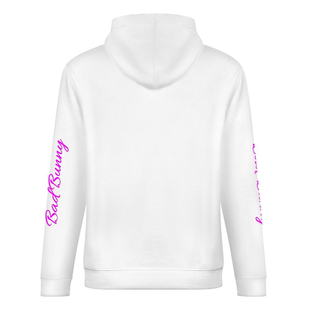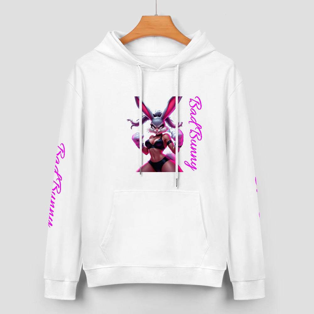 The Bad Bunny Hoodie is all bite, no fluff. Featuring a bold cartoon bunny girl in a fierce stance, this white hoodie makes its point with a wink — and a punch. The words “Bad Bunny” run down each sleeve in hot pink script, turning this cozy pullover into a full-on statement. Equal parts flirty and fearless, it’s the perfect hoodie for girls who don’t play nice (unless they feel like it).【 Material description 】