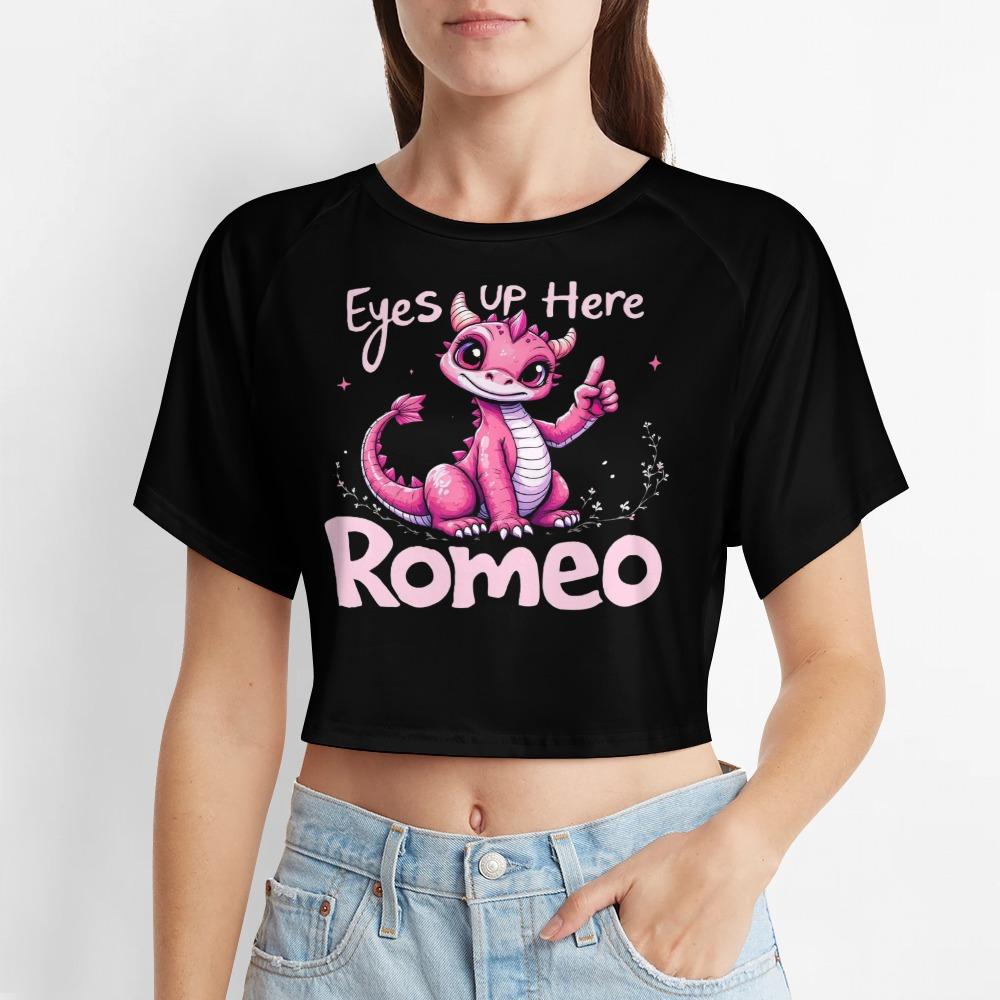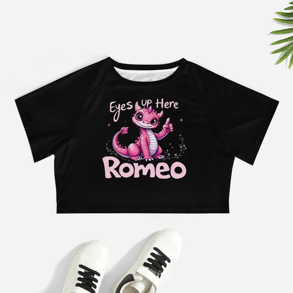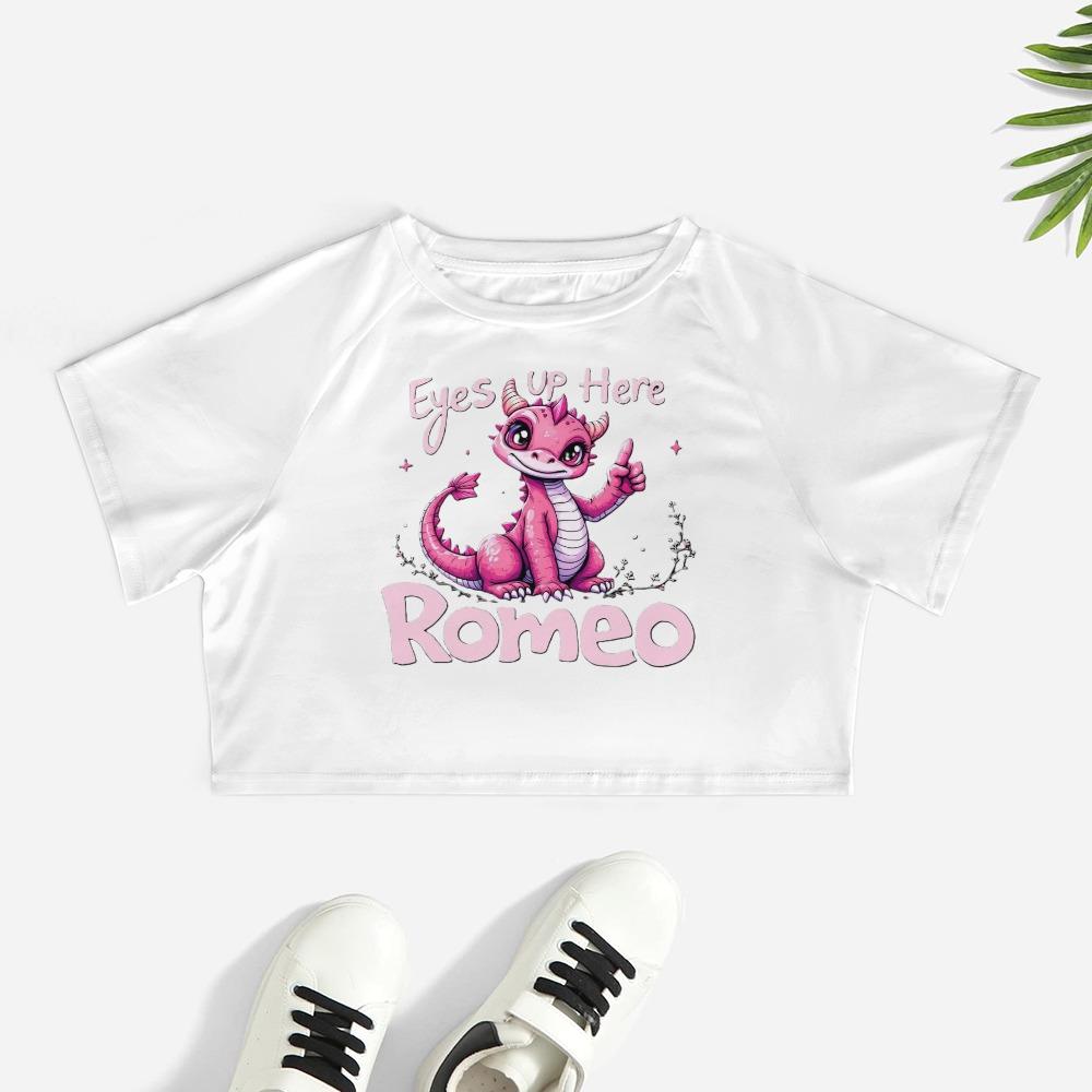 The Eyes Up Here Romeo Crop Top brings flirty sass with a fantasy twist. Featuring a mischievous pink dragon and the cheeky reminder “Eyes Up Here,” this playful design is all sparkle, charm, and soft rebellion. It’s cute, confident, and totally irresistible — perfect for girls who know how to flirt without saying a word. Pair it with pastel skirts or soft denim for the ultimate dreamy vibe.【 Material Description 】