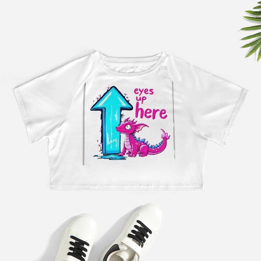 The Eyes Up Here Crop – Pink Dragon Flirt Tee with Arrow Graphic is a cheeky statement piece made to break necks and start conversations. This bold white crop top features a wide-eyed pink dragon guarding a giant electric-blue arrow pointing straight up, paired with the classic flirty phrase “Eyes Up Here” in vibrant magenta graffiti. It’s cute, confident, and impossible to ignore.