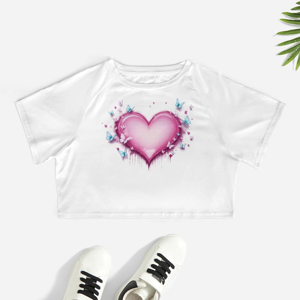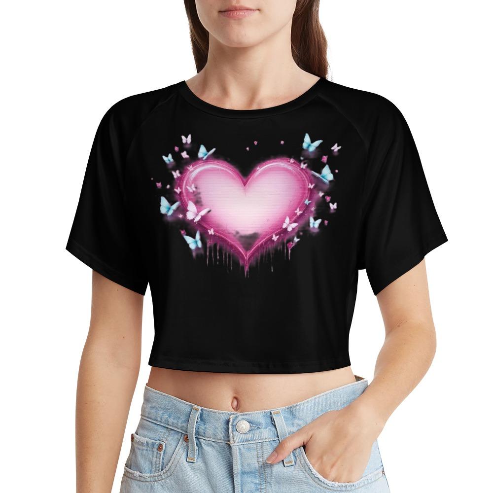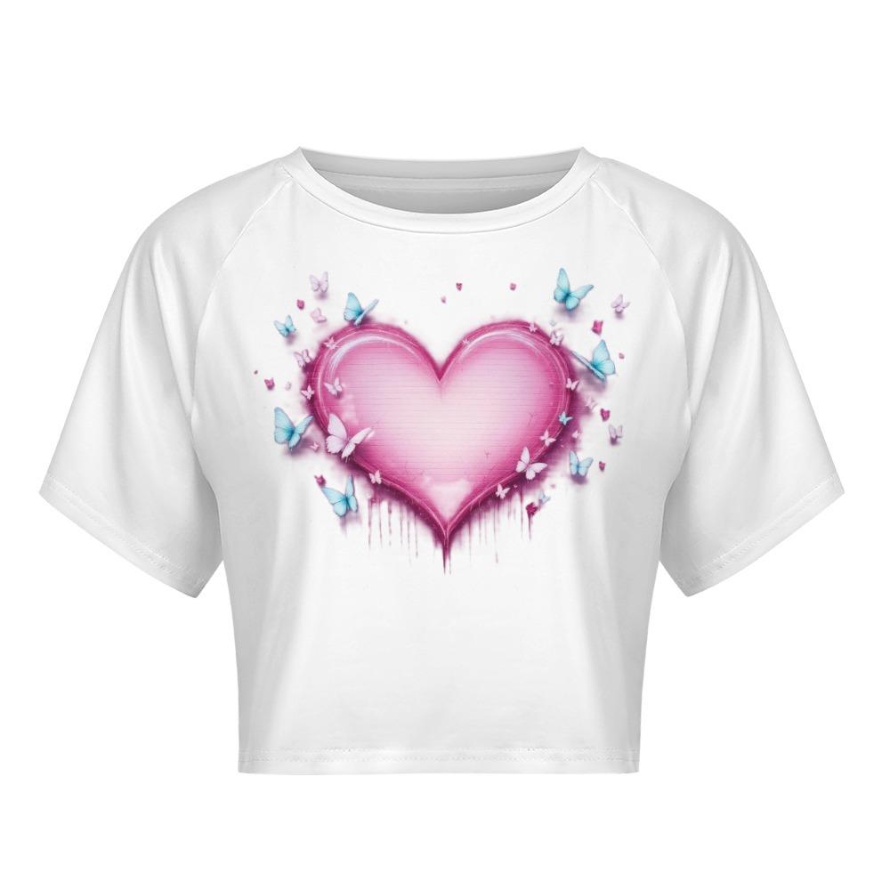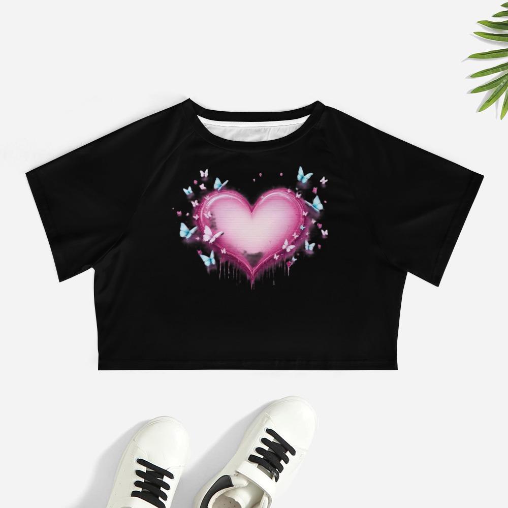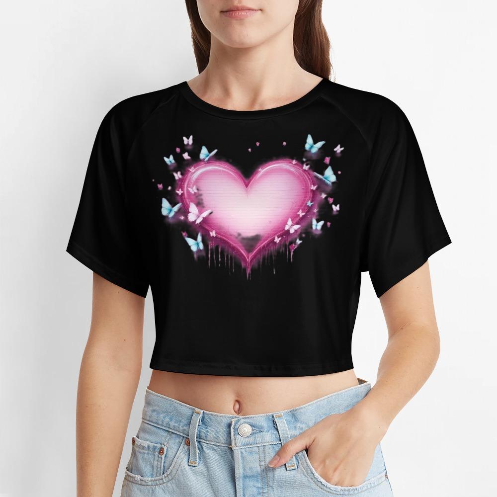 This crop top glows with a radiant pink heart that drips with emotion and flutters with dreamy blue butterflies. It’s soft, sensitive, and just a little dramatic — like a love story that still makes your chest flutter.