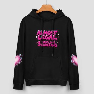The Almost Legal Hoodie is playful, provocative, and totally unapologetic. Featuring a loud pink graphic that reads “Almost Legal – 3 Days and Counting” with sparkles and hearts, this black hoodie is made to tease and turn heads. With pink graffiti heart graphics on each sleeve, it’s dripping with bold birthday-girl energy and just the…