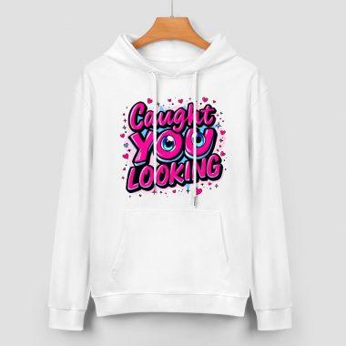 The Caught You Looking Hoodie is all sass and no apologies. Featuring bold pink and blue bubble text and cartoon eyes front and center, this black hoodie is made to grab attention — and call it out. Whether you’re teasing your crush or making strangers blush, this one says exactly what they’re thinking.【 Material description…